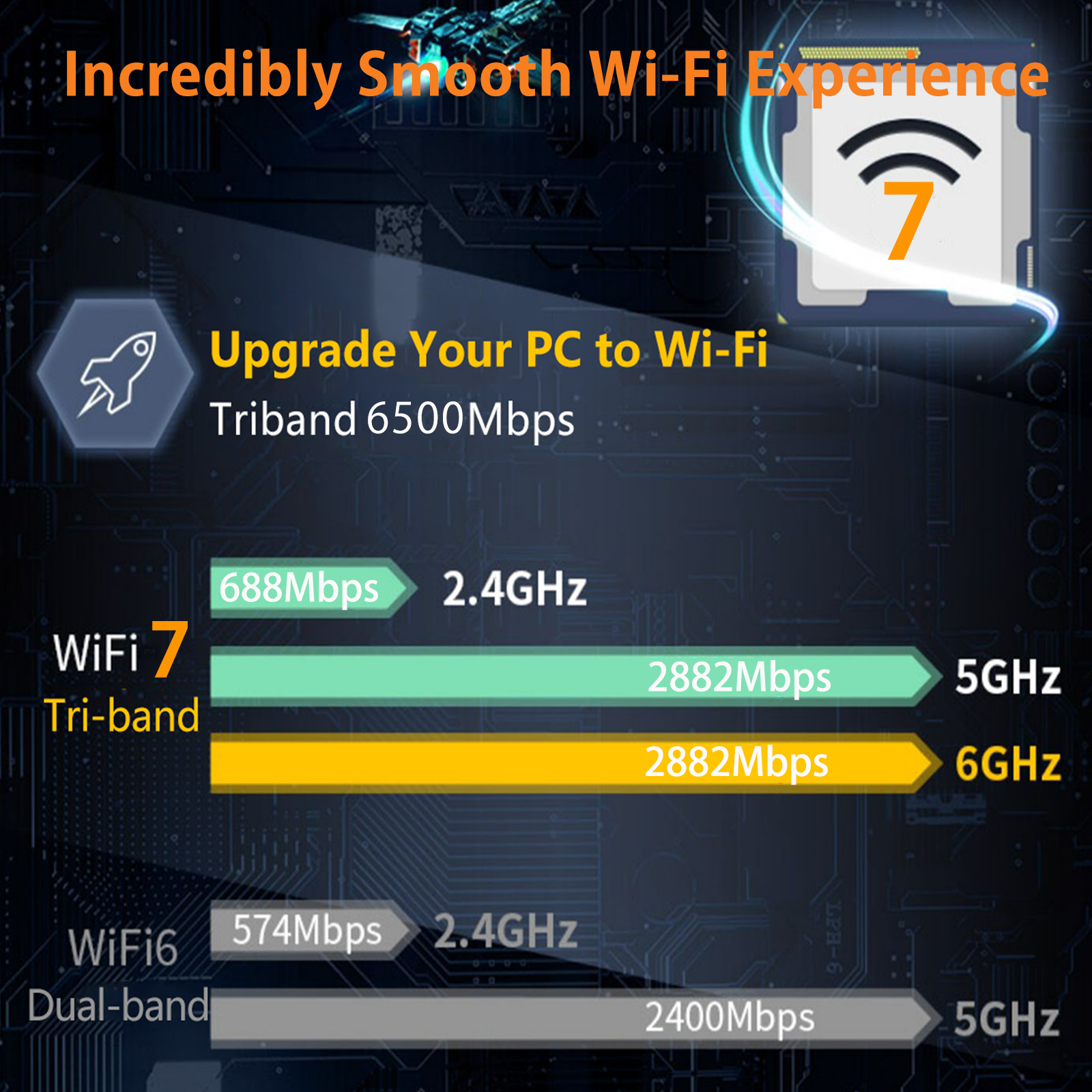 WiFi 7 Unmatched tri-band speed --- Boost your overall speed to up to 2882 Mbps (6 GHz) + 2882 Mbps (5 GHz) + 688 Mbps (2.4 GHz)